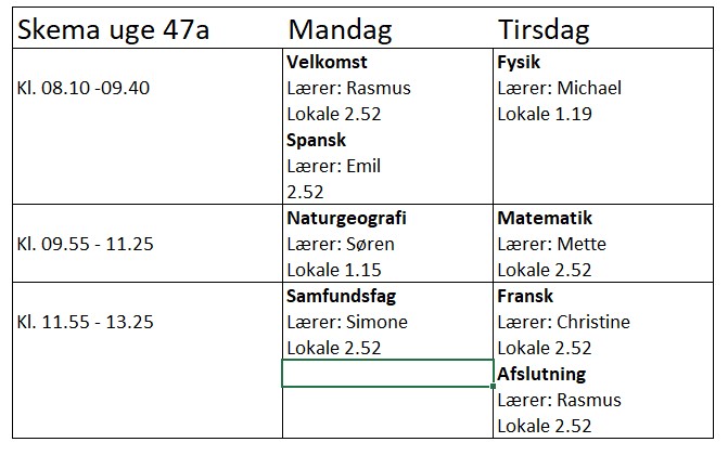 Du skal møde i forhallen den første dag, hvor du vil blive modtaget af en studievejleder kl. 8.10. Derefter vil du få en rundvisning og en kort introduktion til skolen og vores IT-programmer.